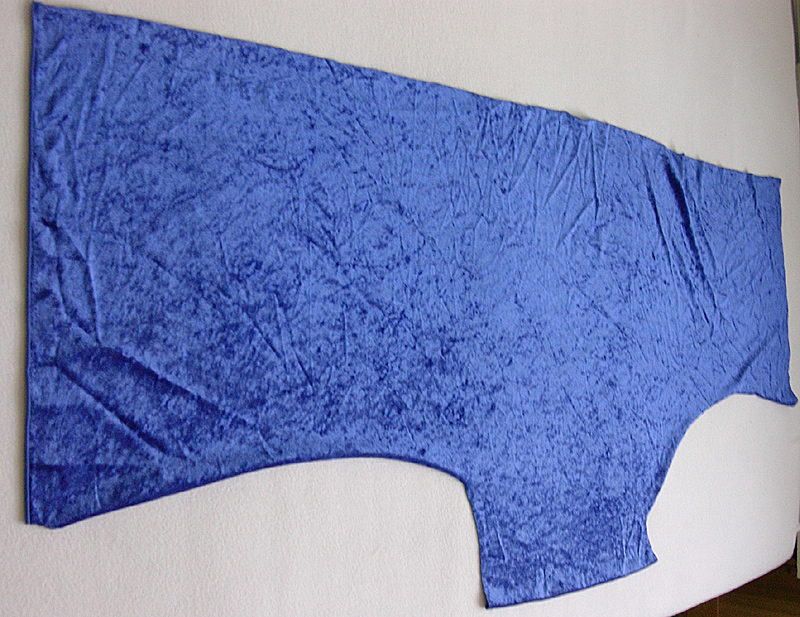 Ein Stoffrest in Blau, er liegt 150 cm breit und ist 40 cm tief an der schmalsten Stelle. Man bekommt locker ein Gürtel/BH-Set samt Stulpen daraus geschneidert.